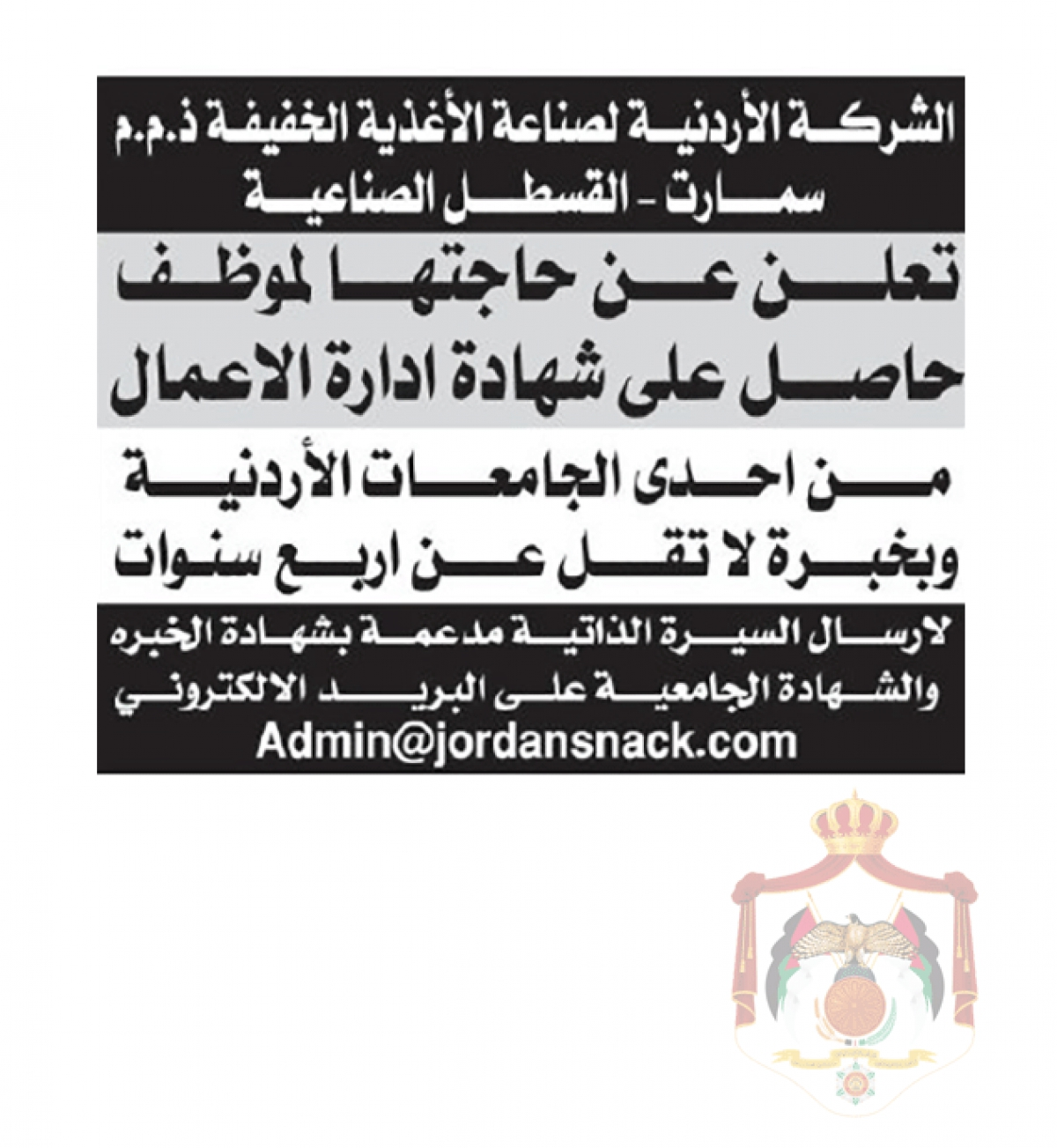 اعلان وظائف شاغرة صادرعن الشركة الأردنية لصناعة الأغذية الخفيفة 30 مارس 2024 تويتر واتساب بنترست لينكدين تمبلر لاين بريد أنسخ الرابط هل اداء الموقع جيد ؟